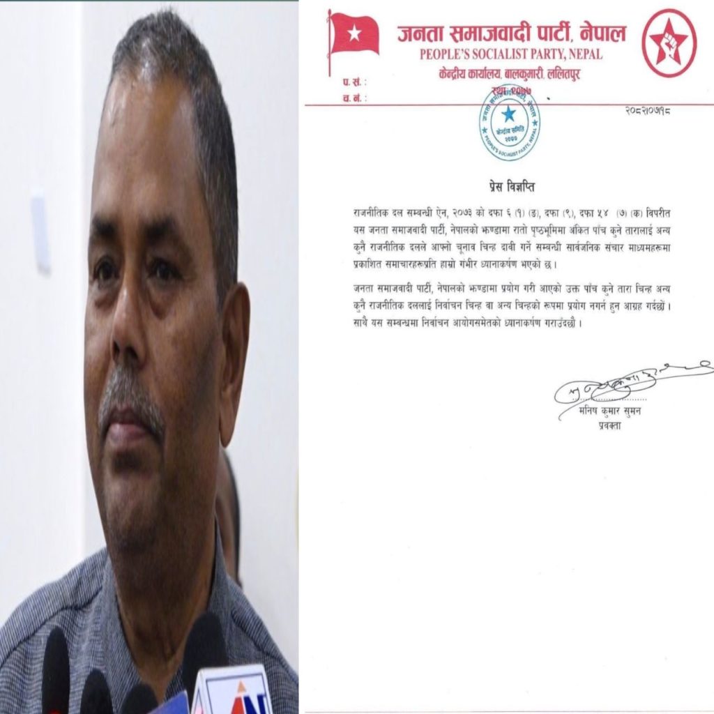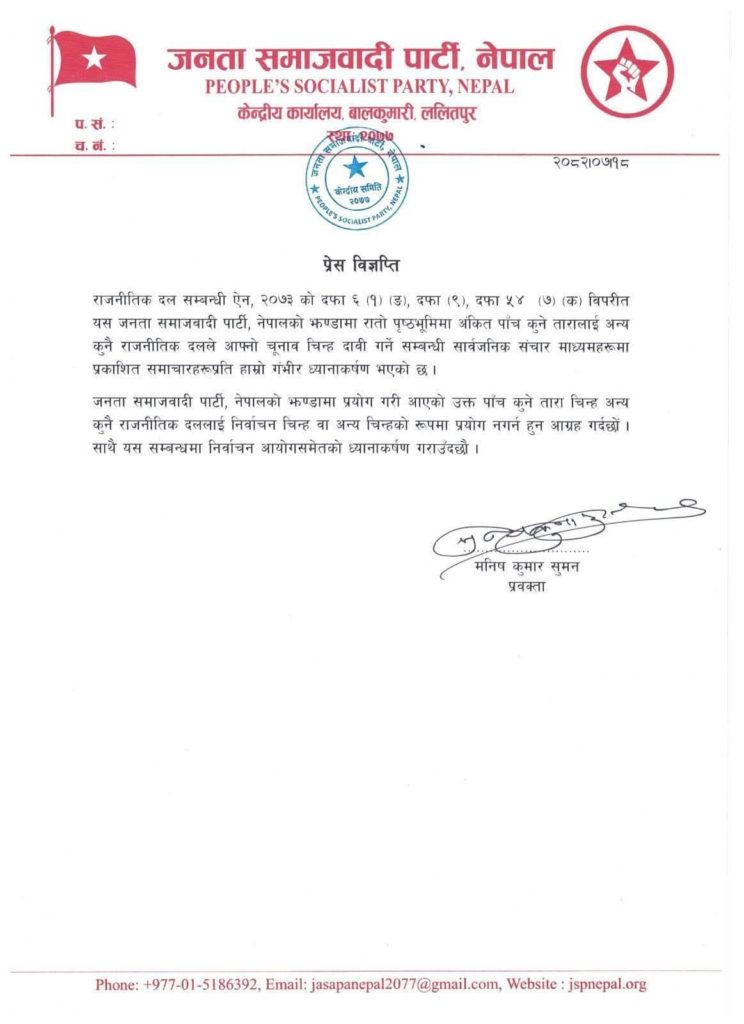 पार्टीका प्रवक्ता मनिष कुमार सुमनले मंगलबार एक प्रेस विज्ञप्ति जारी गर्दै राजनीतिक दल सम्बन्धी ऐन, २०७३ को दफा ६ (१) (ङ), दफा ९ र दफा ५४ (७) (क) विपरीत जनता समाजवादी पार्टी, नेपालको झण्डामा अंकित रातो पृष्ठभूमिमा रहेको पाँच कुने तारा चिन्हलाई अन्य दलले आफ्नो चुनाव चिन्हको रूपमा प्रयोग गर्न खोजेको जानकारी प्राप्त भएको उल्लेख गर्नुभएको छ ।